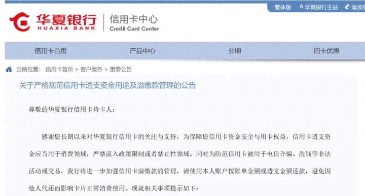 华夏银行信用卡中心近日发布公告,明确强化信用卡透支资金用途管理,并同步加强对“溢缴款”等高风险环节的管控,多项表述直指通过虚假交易、异常还款等方式变相套取信用卡资金的行为。