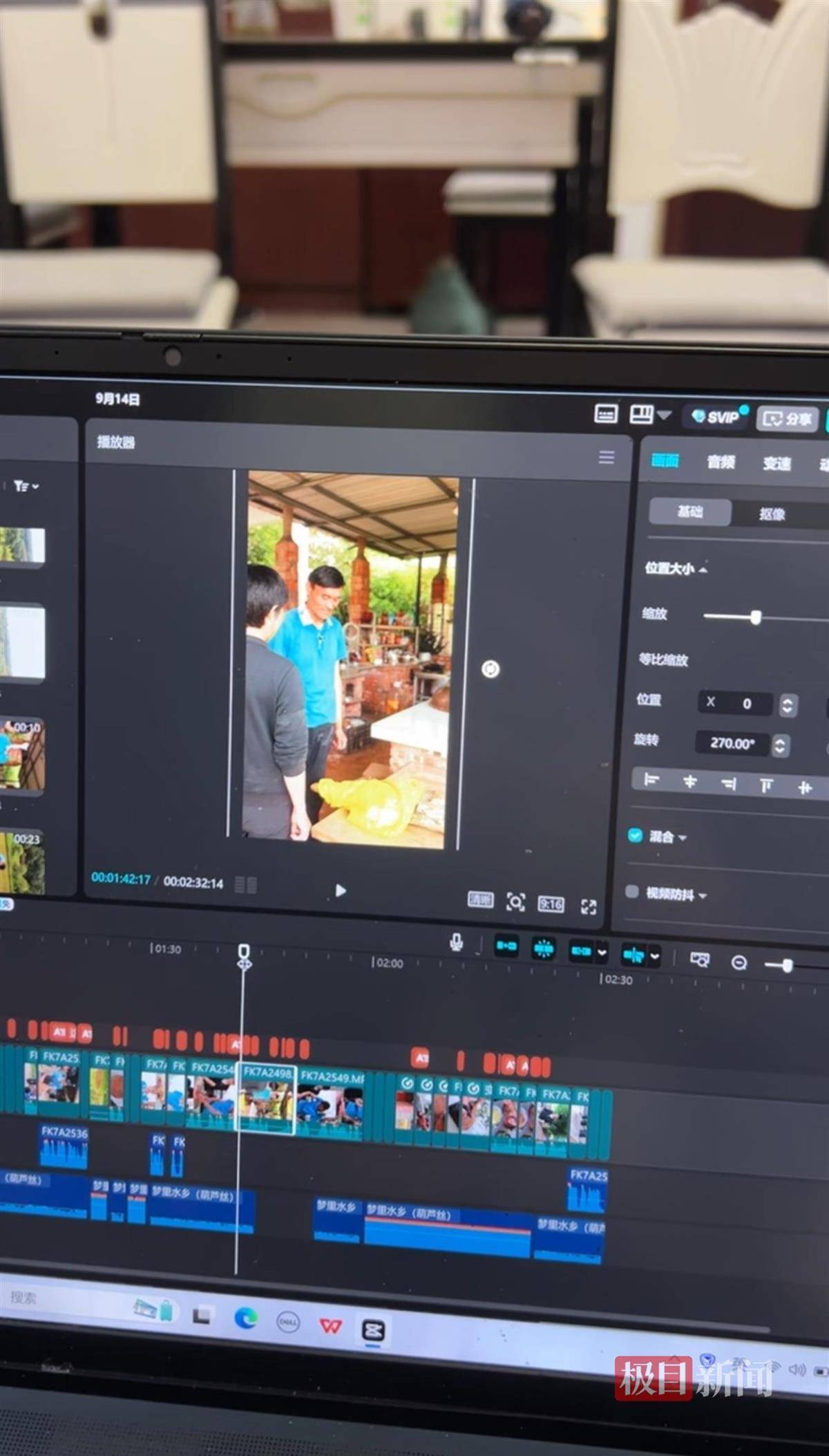 除了日常带货直播,程运付的社媒账号也日常更新短视频,最近的一条与刘德华线上演唱会相关。有网友质疑,他被MCN包装过。程运付如此向记者回应:“其实最火的时候,我也是自己拍摄剪辑,有MCN来找过,被拒绝了。”说着,他打开电脑,向记者展示视频拍摄过程,前景、后景、虚焦……他一一介绍。对着一支时长近3分钟的短视频,他打开剪辑软件告诉记者,素材都由自己和儿子用相机拍摄完成,台词也是日常生活聊天使用的风格。“以前没接触过这些,每个视频都是自己学着用电脑剪辑的,这个视频拍摄用了一天,剪辑用了一天。”他说。
